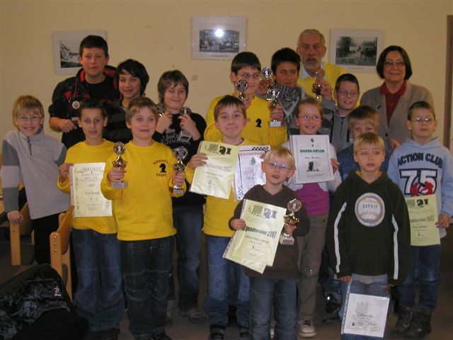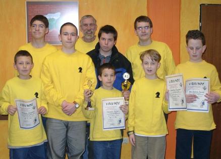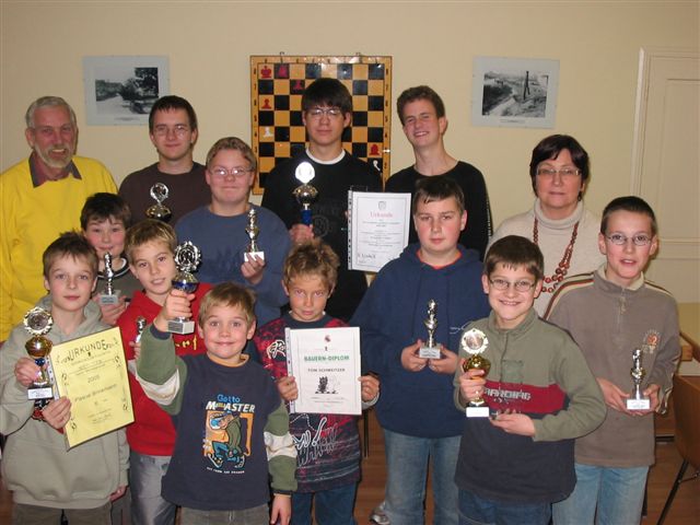 19.12.2005 Bürgermeisterin Anne Werderich übergibt Pokale und Urkunden Am 19.12. besuchte uns unsere Bürgermeisterin beim letzten Jugendschach 2005. Frau Werderich übergab Pokale und Urkunden, die im Laufe des Jahres erspielt wurden. Das Bild zeigt die strahlenden Sieger ihrer Altersklassen: Alexander Störig und Felix Salwiczek, Adrian Reinhardt, Niklas Heinze und Jannik Scherer. Mit ihnen freuen sich die übrigen Platzierten Daniel Weinberger, Moritz Zentgraf, Marcus Gossmann, Sebastian Breidenstein, Pascal Brinkmann und Jan-Hendrik Baumert sowie Tom Schweitzer, der das Turmdiplom bestand.
