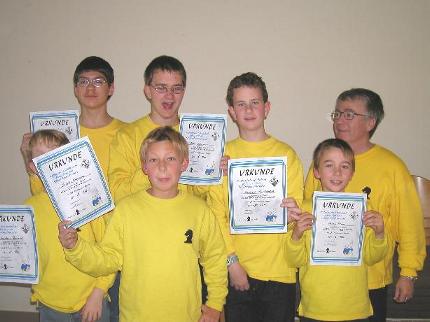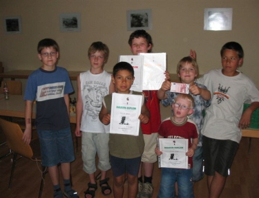 18.07.2005 Diplome des Deutschen Schachbundes vergeben Am 4. und 11. Juli hatte unser Nachwuchs die Möglichkeit, das im 1. Halbjahr erlernte und geübte Schachwissen unter Beweis zu stellen. Und das gelang. Am 18. Juli, dem letzten Übungsnachmittag vor den Ferien, konnten die begehrten Diplome ausgehändigt werden. Sebastian Breidenstein, Marcus Gossmann, Jannik Scherer und Daniel Weinberger bestanden das Turmdiplom, das schon fortgeschrittenes Wissen voraussetzt.. Hier mussten innerhalb von 60 Minuten 12 Aufgaben gelöst werden. Beim Bauerndiplom sind innerhalb von 45 Minuten 8 Aufgaben zu den Grundkenntnissen zu lösen. Dies gelang Leon Brede, Carsten Mitter und Patrick Scheele. Sebastian Breidenstein, Jannik Scherer und Leon Brede erreichten in ihren jeweiligen Kategorien fast die Höchstpunktzahl! Nach den Ferien geht es mit dem Jugendschach am 4. September wieder weiter. Das Bild zeigt von links: Patrick Scheele, Jannik Scherer, Sebastian Breidenstein, Marcus Gossmann, Daniel Weinberger, Carsten Mitter und Leon Brede.