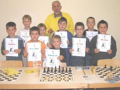 18.10.03 1. Runde Schulschachpokal 2003/2004: Jonathan Baumert bester Fuldataler Am 18. Oktober fand in Simmershausen im Haus der Vereine die 1. Runde der Schulschach-Rallye statt. 33 Teilnehmer in 4 Wertungsklassen (WK) waren dabei. In der WK I starteten Alexander Störig (Platz 10) und Felix Salwiczek (8) unter 13 Teilnehmern. In der WK 3 mit 11 Teilnehmern kamen Vincenzo Kiewning auf den 8. und Jan-Hendrik Baumert auf den 10. Platz. In der WK 4 konnte Jonathan Baumert unter 6 Teilnehmern den 2. Platz belegen (leider verdeckt durch Vincenzos Urkunde). Bei einer um 2 Punkte besseren Buchholzzahl wäre er Pokalsieger geworden!
