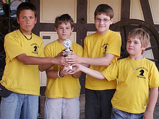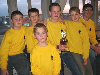 09.06.2007: Die Jugendmannschaft ist Bezirksmeister 2006/2007 der Kreisjugendligen Am 09.06.2007 fand in Baunatal das Halbfinale und das Endspiel um die Meisterschaft der Kreisjugendligen Staffeln Ost und West statt. Im ersten Spiel trafen wir auf den Sieger der Staffel West, den SK Baunatal. Relativ schnell gewann Aurelio Kiewning sein Spiel (eine halbe Stunde/19 Züge). Dann wurde Jannik Scherer nach einem zunächst ziemlich ausgeglichenen Spiel durch seínen Gegner patt gesetzt.(63 Züge). Adrian Reinhardts Gegner traf verspätet ein und verlor sein Spiel nach 23 Zügen, wobei Adrian eine Minute später auch nach Zeit gewonnen hätte. Damit führten wir mit 2,5 : 0,5 Punkten. Pascal Brinkmann spielte gegen Jan Taege und kämpfte trotz schlechterer Stellung verbissen weiter, da seinem Gegner die Zeit davon lief. Weniger als eine Minute (!) vor Zeitablauf musste er sich dann jedoch geschlagen geben, so dass die Paarung Baunatal - Fuldatal mit 1,5:2,5 Punkten ausging. (Jan konnte drei Minuten vor Partieschluss mit der Notation aufhören, sonst hätte Pascal über Zeit gewonnen.) Damit war das Finale erreicht. (v.l.) Aurelio Kiewning, Pascal Brinkmann, Adrian Reinhardt und Jannik Scherer Lohfelden spielte gegen Korbach, die nur mit drei Spielern angereist waren, 2 : 2, so dass der Finalist durch Blitzen ausgespielt werden musste. Die Partien im Blitzen konnte Korbach für sich entscheiden. Unser zweiter Gegner stand also fest. Adrian Reinhardt konnte den ersten Punkt kampflos einfahren. Jannik Scherer gewann das zweite Spiel durch schnellen Damengewinn mit 41 Zügen, sein Gegner gab auf. Pascal Brinkmann konnte sein zweites Spiel leider nicht für sich entscheiden, so dass es nach etwas über einer Stunde 2 : 1 für Fuldatal stand. Alles hing jetzt von dem Spiel von Aurelio Kiewning ab. Weder sein Gegner noch er schenkten sich was. Es wurde gekämpft bis die Köpfe rauchten, wobei auch Aurelio einmal matt gesetzt hätte werden können. Aber wie das so ist, nicht nur wir übersehen Chancen, der Gegner auch!!!! Mit viel Nerven und Ausdauer konnte Aurelio die Partie schließlich nach 44 Zügen und knapp 1 1/2 Stunden für sich entscheiden. Das Endergebnis der Finalrunde lautet damit Korbach-Fuldatal 1 : 3