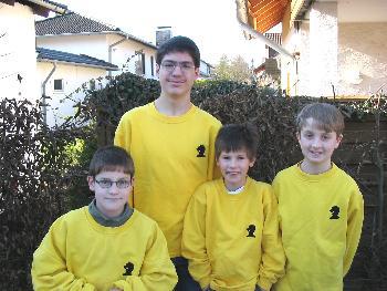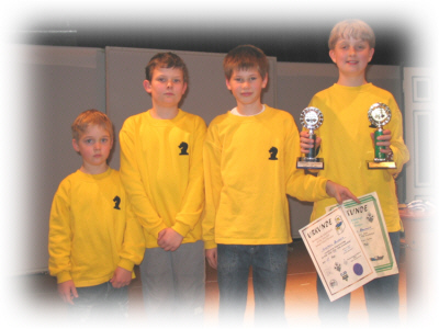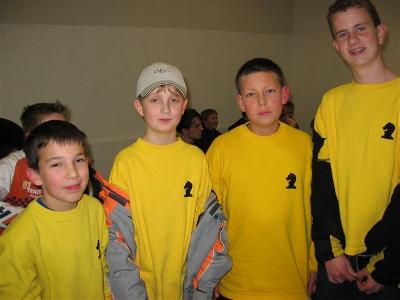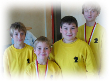 4. Platz bei den Hessischen Mannschafts-Meisterschaften U 14 Am 20.11.2004 fanden in Biebertal-Fellingshausen die Hessischen U-14-Mannschafts- meisterschaften statt. Wir waren mit Benjamin Aslan, Jonathan Baumert, Vincenzo Kiewning und Jan.Hendrik Baumert dabei (siehe Bild v.l.n.r.). Das Turnier begann mit einstündiger Verspätung um 11 Uhr. Sieben Runden mit jeweils 30 Minuten Bedenkzeit waren zu spielen. Vor Beginn der letzten Runde war klar: Das letzte Spiel gegen Herborn musste gewonnen werden und unsere Konkurrenten Roßdorf und Gernsheim mussten verlieren. Dann hätten wir den 3. Platz erreicht. Die erste Hürde wurde genommen: Wir siegten 3:1 gegen Herborn. Auch die zweite Hürde schafften wir mit Hilfe Neubergs, die 3:1 gegen Gernsheim gewannen. Und auch das letztlich entscheidende Spiel schien für uns zu laufen: 1:1 zwischen Roßdorf und Hofheim. Und die beiden noch nicht entschiedenen Partien sahen gut für Hofheim aus. Aber dann patzen die beiden Hofheimer. Und um 18:45 Uhr stand fest: Fuldatal ist Vierter! Der 3. Platz wurde um einen einzigen Mannschaftspunkt verfehlt. Dennoch waren die Fuldataler sehr zufrieden. Dies war das beste Ergebnis einer Jugendmannschaft bei den Hessischen Meisterschaften bisher!