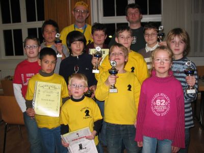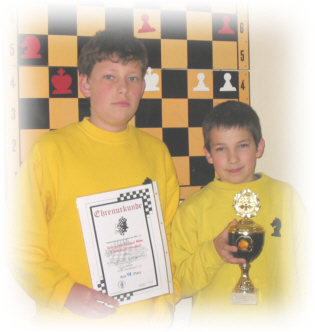 Bezirks-Einzelmeisterschaften U 12 Am Sonntag, den 07.03.2004 fanden die nordhessischen Einzelmeisterschaften für die Jahrgänge 1992 und 1993 bei Hermannia Kassel statt. Insgesamt nahmen 15 Jugendliche aus 6 Vereinen teil. Darunter auch 4 Fuldataler, die sich gut platzieren konnten. Insgesamt waren 7 Runden mit je 30 Minuten Bedenkzeit zu spielen. Benjamin Aslan wurde mit 5 Punkten Vizemeister. Auf den Plätzen 4 und 5 folgten bereits Jan-Hendik Baumert (4,5 Punkte) und Janek Thöne (4 Punkte). Mit ebenfalls 4 Punkten, aber schlechterer Buchholzwertung, kam Jonathan Baumert auf Platz 8. Ein erfolgreiches Abschneiden unseres Nachwuchses.