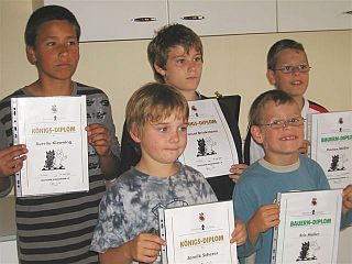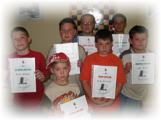 23.06.2003 Diplome des Deutschen Schachbundes Am 23.06. meldeten sich 13 Nachwuchsspieler zur Abnahme der Diplome des Deutschen Schachbundes an. Die niedrigste Schwierigkeitsstufe wird im Bauerndiplom gefordert. Hier sind besonders hervorzuheben die Leistungen von Lukas Krug (8 Jahre) und Adrian Reinhardt (9 Jahre). Höhere Anforderungen an das Schachwissen stellt das Turmdiplom und der höchste Schwierigkeitsgrad ist beim Königsdiplom zu bewältigen. Alle Diplomanwärter erreichten ihr Ziel. In Klammern sind angegeben die erreichte Punktzahl / Höchstpunktzahl. Wiederum ein schöner Anlass, sich zu freuen und ganz herzlich zu gratulieren. Bauerndiplom: Adrian Reinhardt (8/8), Lukas Krug (8/8), Kolja Eckert (7,5/8), Janek Thöne (7/8), Moritz Zentgraf (6/8