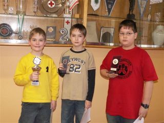 12.02.2005: Jonathan Baumert gewinnt die Wertungsklasse 3! An der 4. Runde der Schulschach Rallye 2004/2005 kämpften 68 SchülerInnen um Pokale und Plätze. In der zahlenmäßig größten Gruppe, der Wertungsklasse (WK) 4 mit 32 Spielern, konnten sich Jannik Scherer, Alexander Kaiser und Lukas Krug zwar gut verkaufen, aber Lukas konnte keine Punkte im Kampf um Platz 2 der Gesamtwertung gutmachen. Im Gegenteil: Sein Konkurrent Constantin Blaschke (Baunatal) egalisierte den 1-Punkt-Rückstand. Beide liegen nun mit 13 Punkten im Kampf um Platz 2 gleichauf. Lukas muss sich bei der letzten Runde am 16. April in Zierenberg auf jeden Fall vor Constantin platzieren. Überaus erfolgreich präsentierte sich Jonathan Baumert. Er siegte ungeschlagen und konnte sich über die Verbesserung seines Punktepolsters für die Gesamtwertung freuen. Insbesondere der Gewinn der Partie gegen Marwin Xibratu (Baunatal) war wichtig. Damit wurde ein Konkurrent um den Gesamtsieg ausgeschaltet. Jonathan steht schon jetzt als Gesamtsieger fest!