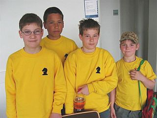 13.10.2005 Hessischer Schulschach-Pokal 2005 Am 13. Oktober trafen sich in Bad Nauheim 127 Vierer-Mannschaften aus 60 hessischen Schulen. Rund 500 Schüler von der Grundschule bis zur Oberstufe kämpften in 5 Wettkampfgruppen um Punkte und Plätze. Jeweils 7 Runden mit 15 Minuten Bedenkzeit je Spieler mussten mit Vierermannschaften ausgespielt werden. Wir unterstützten eine Mannschaft der Gesamtschule Fuldatal (GSF). Unter 24 Mannschaften in der Wettkampfgruppe 2 (Jahrgänge 1991 und jünger) kam die GSF mit 7 : 7 Punkten auf Platz 11. Nur 2 Mannschaftspunkte trennten uns vom 4. Platz! Leistungsträger dieses Erfolgs waren Jan-Hendrik Baumert (mit 7 Punkten von 7 möglichen!!) und Vincenzo Kiewning (5,5 Punkte). Dieses Turnier hat Lust auf den Schulschach-Mannschaftswettbewerb gemacht, der im November beginnt. Im Bild (von links): Vincenzo Kiewning, Jan-Hendrik Baumert, Tobias Ammann, Niklas Heinze und Florian Schade