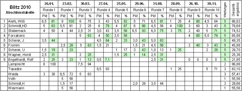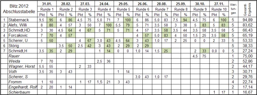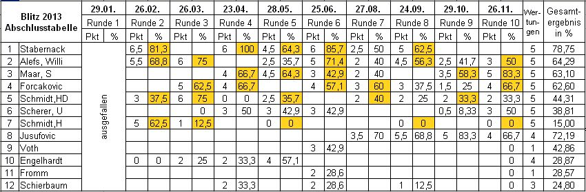 Blitzmeister 2016 Iliaz Jusufovic Am 29.11. fand die 10. und letzte Runde des Blitzturniers statt. 9 Teilnehmer/innen beteiligten sich hieran. Im laufenden Jahr nahmen insgesamt 14 Vereinsmitglieder an diesem Turnier teil. In die Endwertung kamen 6 Spieler. Überlegen mit 35 ½ Punkten aus 36 Spielen sicherte sich Iljaz Jusufovic den Titel, Vizemeister mit 3 0 ½ aus 33 Spielen wurde Samuel Maar, in die Wertung kamen noch W. Alefs, H. Forcakovic, M. Lange und H. Schmidt. |
