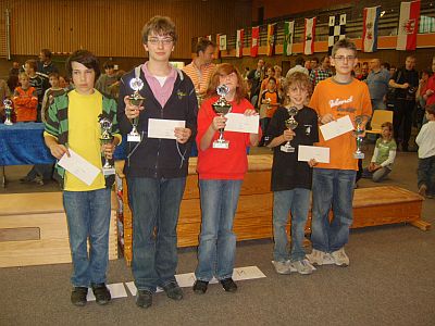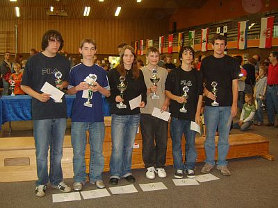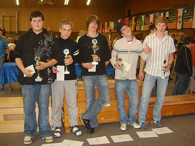 U 16: v.l.n.r.: 3. Leander Fink (Kinzigtal),2. Manuel Weller (Ramstein), Mädchenpokal Amandine Schilling (Caissa Kassel), 1. Christoph Nolte (Paderborn), 4. Makan Rafiee (Kasseler SK) und 5. Dennis Hummel (Neuberg) |