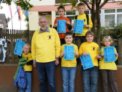 Von links stehend Noah (Turmdiplom), Betreuer Horst Wagner, Matviy (Bauerndiplom) und (sitzend von links) Robin, Thore (beide Bauerndiplom), Ralf und Lisa-Marie mit dem Zeugnis für sehr gute Leistungen