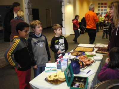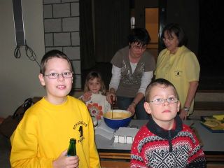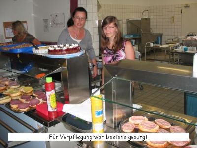 Auch für das leibliche Wohl war gesorgt. Ute Scherer (hinten links) buk frische Waffeln, und Hannelore Schmidt (hinten rechts) sorgte für belegte Brötchen. Im Vordergrund die "Kunden" Florian (links) und Eric Müller. Rechts
