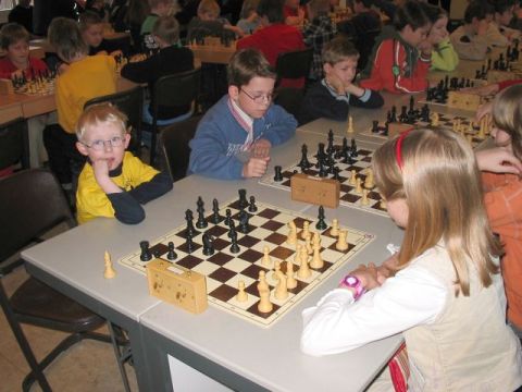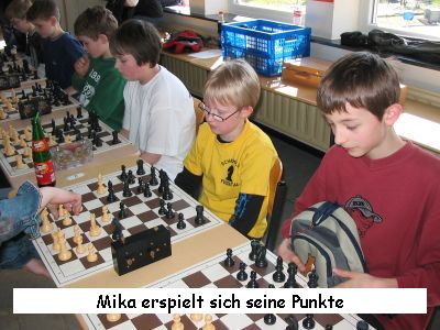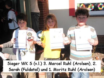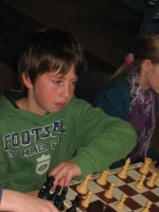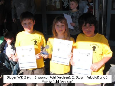 Schulschach Rallye am 09.05.2009 in Ahnatal Am vergangenen Samstag fuhren wir zur 5. und letzten Runde der Schulschach Rallye 2008/2009. Die Beteiligung war wiederum sehr groß: 82 junge und jüngste Schachfreunde hatten sich im Ahnataler Gemeindezentrum eingefunden, darunter 6 Fuldataler. In der WK G (Grundschüler) kamen Timm Reinhardt (5 Punkte) und Mika Lange (4,5 Punkte) auf den 7. und 8. Platz. Moritz Porzucek mit 4 Punkten und Martin Bock mit 3 Punkten landeten im Mittelfeld der mit 45 Teilnehmern stärksten Gruppe. Am besten schnitt Jannik Scherer in der WK 4 mit 5,5 Punkten ab und sicherte sich den 2. Platz.