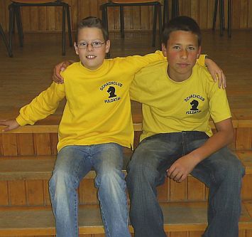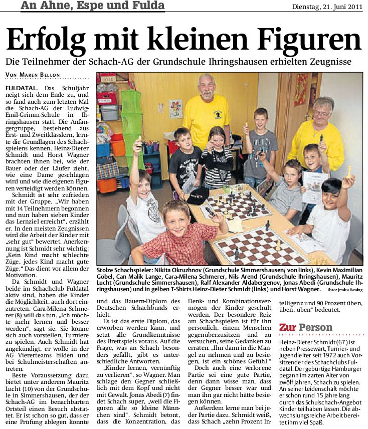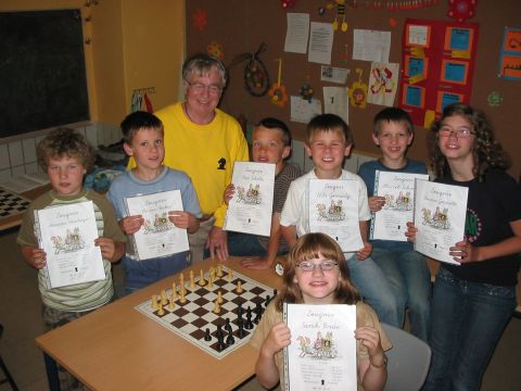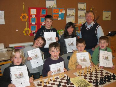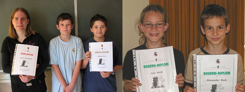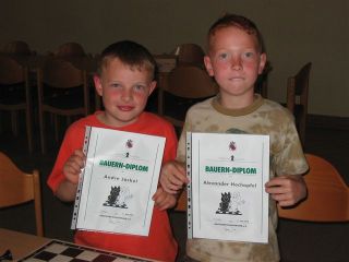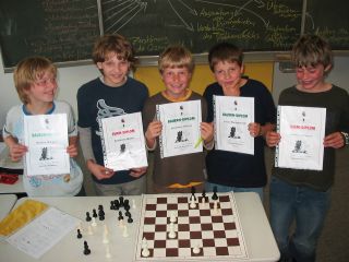 13.06.2007 Schach-AG an der Gesamtschule Fuldatal und an der Grundschule Simmershausen beendet, Diplome überreicht Zum Schuljahresende 2007 hatten die Teilnehmer der Schach AG an der Gesamtschule Fuldatal Gelegenheit, ihr erworbenes Wissen zu testen. Am 13. Juni traten 4 AG-ler zur Prüfung an - und alle bestanden. Denial Anic und Maxim Volkov haben jetzt das Bauerndiplom.
