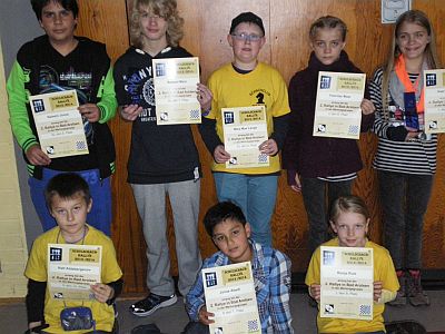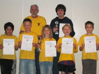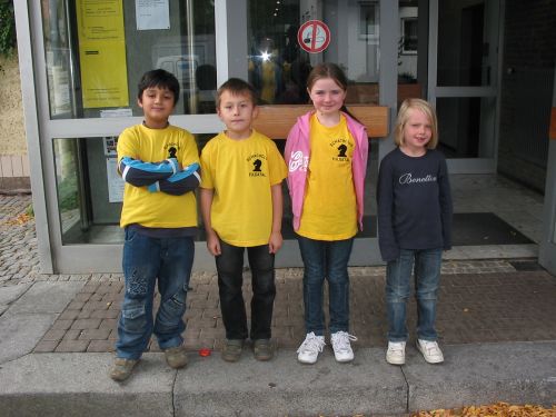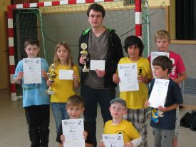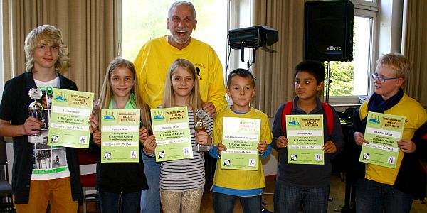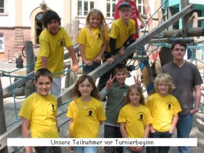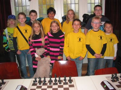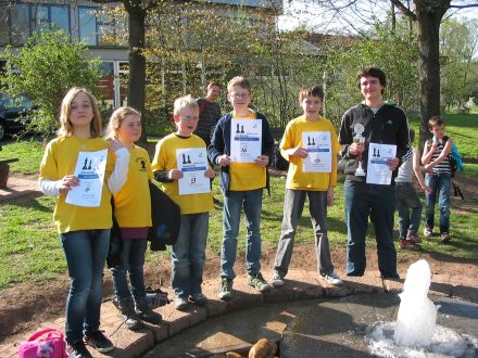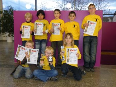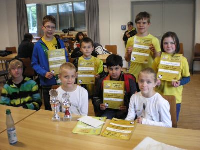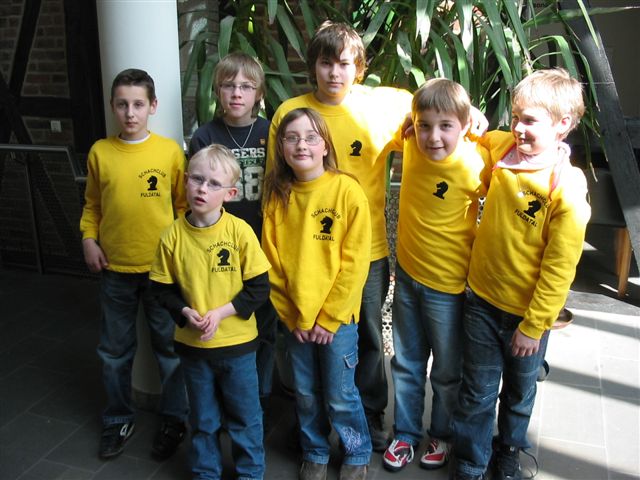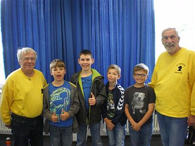Ein Teil der Teilnehmer vom Schachclub Fuldatal (in den mittlerweile “berühmten” gelben Sweatshirts) in der Wertungsgruppe "Grundschüler”: Links von vorn: Jannik Scherer, Lukas Ammann, Selina Jäschke, Lukas Braun und Betreuer Horst Wagner (ganz hinten), Mika Lange (rechts wieder vorne, der zweite).