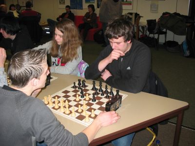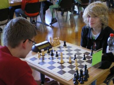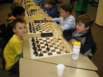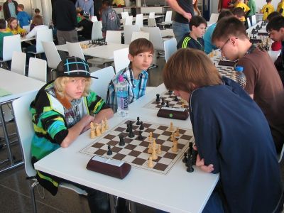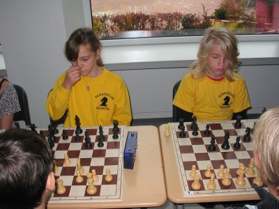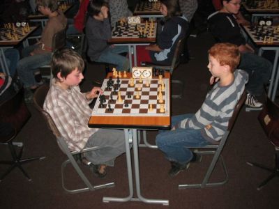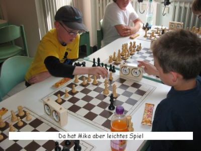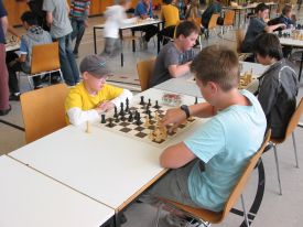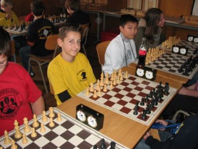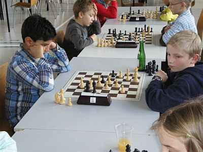 Links: Lukas (Platz 9 in der WK 4) und rechts Kevin mit Schwarz gegen Alex aus den Schach-AGs an der Gesamtschule Fuldatal und der Grundschule Simmershausen