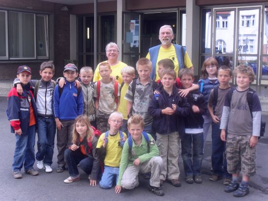 Die Teilnehmer aus Fuldatal vor dem Wilhelmsgymnasium mit ihren Betreuern Horst Wagner (links) und Heinz-Dieter Schmidt (rechts)