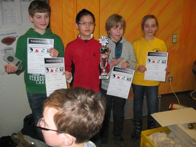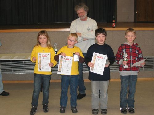 12.12.2009 Schulschachrallye in Lohfelden Am 12.12. traf sich die Schachjugend zur 2. Runde in Lohfelden. Zwar wurde die Rekordbeteiligung von Korbach (112) nicht erreicht, aber mit insgesamt 75 Teilnehmern in 4 Wertungsklassen ein gut besuchtes Turnier. Wir waren mit 8 Spielern dabei. Pokalgewinner war Mika Lange (rechtes Bild vorn Mitte), der in der WK G mit 4 von 7 möglichen Punkten Platz 3 belegte und Sarah Scherer als bestes Mädchen (rechtes Bild vorn rechts).