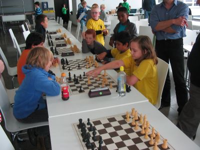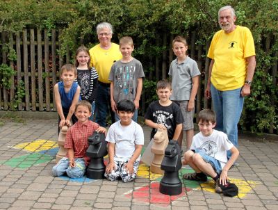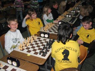 Seit September 2010 erlernt ein neuer Jahrgang das Schachspiel an allen Fuldataler Grundschulen. Aller Anfang ist schwer, besonders die Gangart des Springers. Das wird am Brett mit den "normalen" Figuren oder aber auch auf den Fliesen mit den großen Freischachfiguren geübt.
