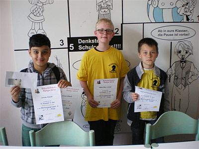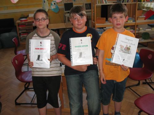 30.06.2010: Schulschach-AG Rothwesten v.l.: Matthias Rehbaum, Dominik Galauch und Hannes Luksch ) Am letzten AG-Schultag erhielten die AG-Teilnehmer in Rothwesten ihre Zeugnisse und Diplome. Zeugnisse für die sehr guten Leistungen bekamen Lukas Lehberger und Hannes Luksch. Dominik Galauch bestand die Prüfung zum Bauerndiplom mit der Höchstpunktzahl. Über ein fehlerloses Turmdiplom freuten sich Matthias Rehbaum und Noa Bergmann.