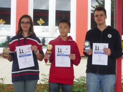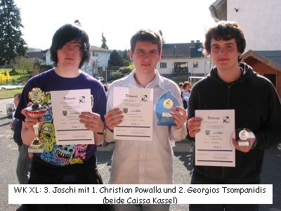 In der Wertungsgruppe S konnte sich Jonas Abedi als bester Fuldataler mit 3,5 Punkte über Platz 16 (von 34) freuen. In der Gruppe L holten Felicitas Maar und Saleem Javed je 4 Punkte, was für die Plätze 6 und 7 reichte. Unmittelbar danach folgte Patricia Maar mit 3,5 Punkten auf Platz 8. In der Gruppe L Gesamtwertung „Mädchen“ siegte Felicitas mit 52 Punkten vor ihrer Schwester Patricia mit 46 Punkten. Der Bruder Samuel fiel in der Gesamtwertung der Gruppe XL mit 16 Punkten auf Platz 5 zurück. Allerdings hatte er in der 4. und 6. Runde wegen der Teilnahme an der Deutschen Schach-Amateur-Meisterschaft pausiert. Das Finale endete am 01.06. für Samuel Maar in der Gruppe F mit einem guten 16. Platz Bild rechts oben: Saleem (links) erkämpft sich den 7. Platz in der Gruppe XL, Bild links unten: Cara und Ralf (Gruppe S) holen jeweils 3 von 7 möglichen Punkten!, Bild rechts unten: Die Fuldataler (stehend von links) David, Ralf, Jonas, Tobias und Cara mit den erfolgreichsten Fuldatalern an diesem Tage: Samuel und Felicitas und Patricia