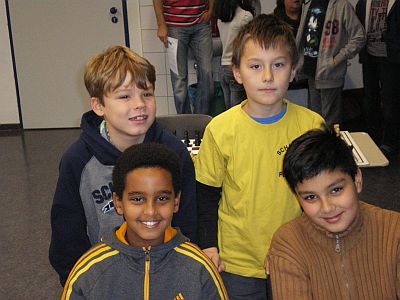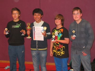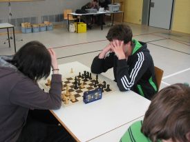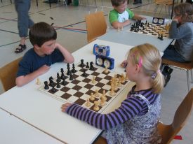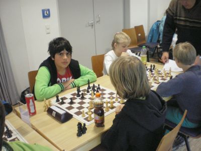 Am 04.12 wurde die 1. Runde der Hess. Schulschach-Mannschafts- meisterschaft 2012/2013 in der Schule am Heideweg in Kassel gespielt. Wir waren mit einer Mannschaft der Ludwig-Emil-Grimm-Schule dabei. Mit in unserer Gruppe befanden sich 2 Mannschaften der Heidewegschule, die Grundschule Kirchditmold und die Reformschule Kassel. Unsere Mannschaft spielte mit Kevin Göbel, Ralf Alexander Aldabergenov, Jonas Abedi und Ronja Ruis. Nur gegen die 1. Mannschaft der Heidewegschule verloren wir: Alle anderen Spiele gingen remis aus. Am Ende hatten wir 5 Mannschaftspunkte und 10 Brettpunkte und landeten knapp auf Platz 5 und sind damit aus dem Wettbewerb ausgeschieden. Aber mit diesem Ergebnis waren wir alle zufrieden. Im Bild (von links) Ronja, Jonas, Ralf und Kevin kämpfen um Punkte.