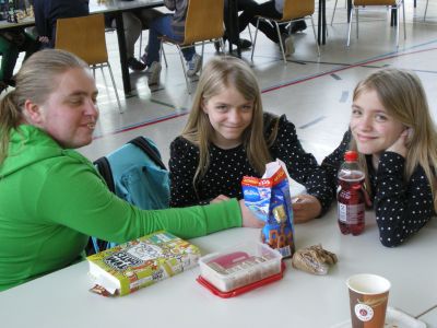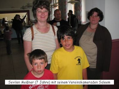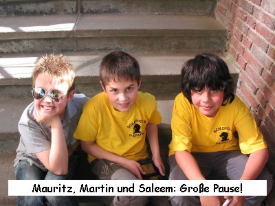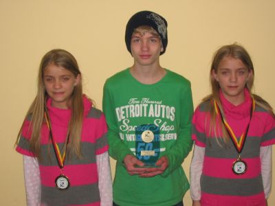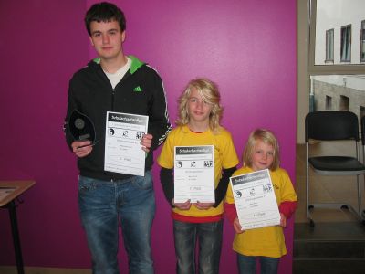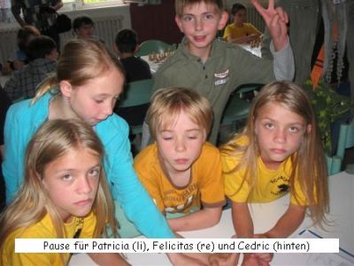 Saleem (2. von links), Sarah (rechts), Jonas (neben Sarah) und Mika (hinten): Auch in den Spielpausen wurde gespielt! Rechtes Bild: Unsere erfolgreichen Mädchen (von links) Patricia (2.), Sarah (1.) und Felicitas (3.)