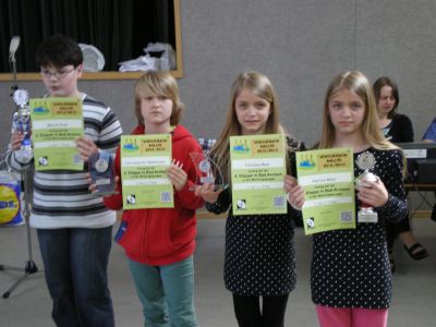 Am 6. Oktober trafen sich in der Kulturhalle Niedervellmar 58 Schulmannschaften mit über 230 Schülern. In 6 Wertungsklassen wurde um Pokale und Plätze gekämpft. Gespielt wurden 7 Runden nach Schweizer System mit 15 Minuten Bedenkzeit je Spieler. Fuldatal war mit einer Mannschaft der Ludwig-Emil-Grimm-Schule in der Wertungsklasse G (=Grundschule) angetreten. Jonas, Ralf Alexander, Cara Milena und Ronja (von links) hatten an der Schach AG 2010/2011 teilgenommen. Und zum Abschluss stand dieses Turnier auf dem Programm. Wenn auch kein vorderer Platz erreicht werden konnte, war es dennoch ein Erfolg. Erstmals Turnieratmosphäre schnuppern! Das beste Ergebnis erzielte die sechsjährige Ronja. Sie holte 3 von 7 möglichen Punkten. Und in der Mannschaft der Albert-Schweitzer-Schule Kassel (WK 3) spielten Sarah und Jannik Scherer vom Schachclub Fuldatal mit. Am Ende landeten sie hinter der Wilhelm-Neuhaus-Schule Hersfeld auf Platz 2!! Herzlichen Glückwunsch!