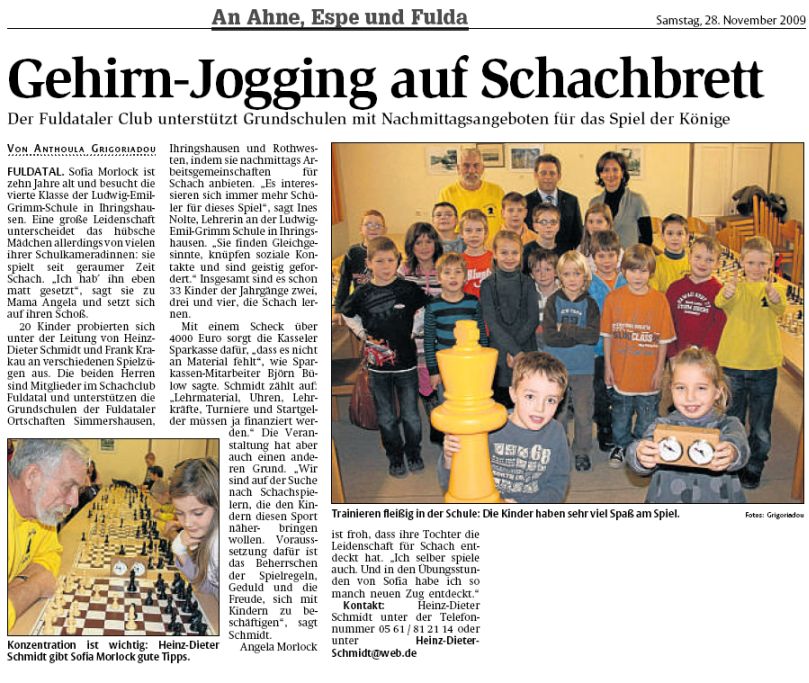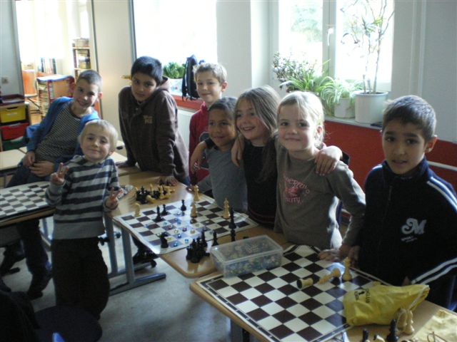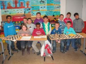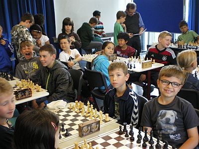 Am 5. Oktober 2011 hat ein neuer Kurs an der Ludwig-Emil-Grimm-Schule in Ihringshausen begonnen. 19 Mädchen und Jungen beschäftigen sich mit dem königlichen Spiel. Manche haben Vorkenntnisse, manche nicht. Gemeinsam wollen wir die Gangart der einzelnen Figuren kennenlernen, auch solche speziellen Züge wie "en passant" oder die Rochade. Und natürlich wollen wir auch erfahren, was Matt, Patt und Remis bedeuten. Diejenigen Schüler, die schon erweiterte Kenntnisse haben, werden bereits in diesem Jahr am hessischen Schulschach-Mannschaftswettbewerb teilnehmen."