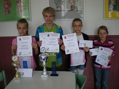11.10.2012: Hessischer Schulschach Pokal 2012 - Platz 15 (von 26) für die Ludwig-Emil-Grimm-Schule - Der Pokal 2012 wurde in der Gesamtschule Obersberg in Bad Hersfeld ausgespielt. Insgesamt 96 Mannschaften waren aus ganz Hessen angereist. Wir spielten mit einer Mannschaft der Ludwig-Emil-Grimm-Schule Ihringshausen in der WK G (=Grundschulen). Mit dieser –auf einer Position veränderten- Mannschaft hatten wir 2011 in Vellmar den letzten Platz belegt. 7 Runden mit je 15 Minuten Bedenkzeit waren zu spielen. Im ersten Spiel gab es ein 2 : 2 gegen die GS Langen. Der Erasmus-Schule Offenbach unterlagen wir knapp mit 1,5 : 2,5, Dann aber gab es ein 4 : 0 gegen die GS Rengshausen. Und mit demselben Ergebnis unterlagen wir anschließend der Wilhelm-Neuhaus-Schule 2 Bad Hersfeld. Aber das warf uns nicht um. 3 : 1 hieß der Endstand gegen die Dornbachschule 2 Oberursel. Und gegen die 2. Mannschaft der Erasmus-Schule Offenbach gewannen wir sicher mit 3 : 1. Nach 6 Runden standen wir auf Platz 9 unter 26 Mannschaften! Im letzten Spiel gegen die JGS Hainburg gab es dann aber nochmals eine herbe 0 . 4-Niederlage und wir fielen in der Tabelle zurück. Am Ende hieß es leider Platz 15 mit 13,5 : 14,5 Brettpunkten und 7 : 7 Mannschaftspunkten. Wir freuen uns über diesen Erfolg von Cara-Milena Schmerer, Kevin Maximilian Göbel, Ralf Alexander Aldabergenov und Jonas Abedi! Sieger dieser Wertungsgruppe wurde übrigens ungeschlagen die Reformschule Kassel.