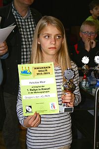 24.05.2014 Finale Schulschachrallye 2013/2014 Samuel und Patricia Maar siegen in ihren Wertungsklassen Die 6. und letzte Runde wurde am 24.05. in der Reformschule Kassel-Wilhelmshöhe ausgetragen. Diesmal hatten nur noch 36 Teilnehmer den Weg zu dem Turnier gefunden. In der Wertungsklasse (WK) XXL siegte Samuel Maar souverän mit 7 Punkten aus 7 Partien. Mit 53 Punkten sicherte er sich damit auch den Sieg in der Gesamtwertung vor seinem härtesten Konkurrenten Moritz Thiel. Mika Lange erspielte sich noch den 6. Platz. Bei der Mädchenwertung in der WK L hatten die Fuldatalerinnen großen Grund zur Freude! Die ersten drei Plätze belegten Patricia Maar (52 Punkte) vor ihrer Schwester Felicitas (50 Punkte) und Ronja Ruis (23 Punkte). Und auch in der WK S war Fuldatal in der Gesamtwertung vorne mit dabei: Jonas Abedi kam mit 25 Punkten auf den 4. Platz! Alles in allem ein sehr schöner Abschluss der Turnierserie für unseren Nachwuchs.