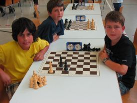 Links: Joschi spielt gegen seinen Konkurrenten Christian Powalla. Die Köpfe rauchen. Am Ende gewinnt Joschi. +++ Mitte: Voll konzentriert dabei: Lachlann +++ Rechts: Saleem kann zufrieden sein. Das Mattsetzen mit Dame und König klappt. Das Üben hat sich gelohnt.