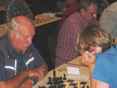 Vom 14. bis 16.07.2011 fanden in Vellmar die 3. Kasseler Schachtage statt. Insgesamt hatten sich 129 Schachfreunde aller Altersgruppen angemeldet. Gespielt wurde in 3 Wettkampfgruppen jeweils 7 Runden mit 2 Stunden Bedenkzeit für 40 Züge. Der SC Fuldatal war in allen Gruppen vertreten. Im A-Turnier mit 45 Teilnehmern erzielte Joschi Stabernack 3,0 Punkte, was für den 28. Platz reichte. Wie gut er spielte, zeigt seine DWZ-Entwicklung: Von 1661 konnte er sich auf 1705 verbessern. Im B-Turnier starteten Willi Alefs und Dieter Kaierle zusammen mit weiteren 56 Spielern. Mit 4,0 Punkten kam Dieter auf Platz 21 vor Willi mit 3,5 Punkten auf Platz 30. Im C-Turnier konnte sich Ute Scherer vom Schachclub Fuldatal unter 25 Konkurrenten durchsetzen. Mit 5,5 Punkten aus 7 Spielen war sie am Ende mit Samuel Weber (SC Flörsheim), gegen den sie gewonnen hatte, punktgleich. So musste die Feinwertung herangezogen werden, um den Sieger zu ermitteln. Und hier hatte Ute Scherer (links, Foto: Günter Preuß) mit 29,0 Buchholzpunkten die bessere Wertung vor Samuel Weber (25,5 Buchholzpunkte). Hannelore Schmidt konnte sich mit 4,0 Punkten über Platz 10 freuen. Ganz eng ging es bei den Geschwistern Scherer zu. Erst in der letzten Runde konnte Jannik mit seiner Schwester nach Punkten gleichziehen. Beide hatten3,5 Punkte und in der Buchholzwertung 24,5. Erst ein knapper Unterschied von 1,5 Punkten (146,0 zu 147,5) entschied zugunsten von Jannik: Platz 11 vor Sarah Platz 12.